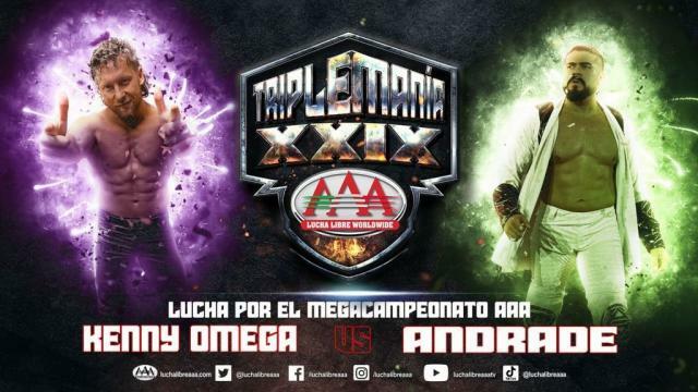 Post-match, la Nueva Generaction Dinamita (Sanson, Forastero et Cuatrero) qui avait quitté la CMLL un peu plus tôt dans la semaine fait son apparition et ses débuts à l'AAA pour attaquer le vainqueur. Aramis et Octagon Jr. Les tecnicos (faces) essaient de faire le sauvetage mais sont envoyés au sol. Les Poder del Norte reviennent à leur tour essayer de repousser l'envahisseur mais ne peuvent rien faire quand la NGD est rejointe par le groupe La Empresa (Puma King, Sam Adonis et DMT Azul), soit une faction à l'AAA d'anciens lutteurs de la CMLL. La Empressa donne ensuite des t-shirts du groupe à la NGD qui les enfilent pour marquer leur alliance.AAA Reina de Reinas Vs. Impact Knockouts Championship Deonna Purrazzo (w. Lady Maravilla) (c) [Impact] def. Faby Apache (w. Lady Shani) (c) [AAA]Sachant qu'il a été indiqué à Impact TV que Purrazzo défendrait son titre Knockouts à NWA Empowerrr à la fin du mois, il ne faisait guère de doutes qu'Apache ne gagnerait pas. L'une des feuds de l'AAA oppose Apache à ... l'arbitre rudo (heel) El Hijo del Tirantes qui l'a plusieurs arnaqué sur des tombés. Dans ce match, Tirantes a même essayé de lui porter une Clothesline mais Apache l'a contré et envoyé à l'extérieur. Purrazzo profite que sa rivale ne soit pas 100% concentrée sur elle pour lui appliquer un Gotch Piledriver suivi de sa Venus de Milo pour devenir double championne.AAA Tag Team Championship Lucha Brothers (Pentagon Jr. et Fenix) (c) def. Los Jinetes del Aire (Laredo Kid et Hijo del Vikingo) et Taurus/Brian CageCage était le partenaire mystère de Taurus. Il avait pourtant été annoncé que Taurus ferait équipe avec un ancien champion par équipe de la ROH ... ce qui n'a jamais été le cas de Cage. Spotfest match qui se termine avec Pentagon Jr. portant un Mexican Destroyer sur Cage et Fenix suivant avec un Cutter sur Taurus avant que les Lucha Brothers n'achèvent un Hijo del Vikingo déjà affaibli avec un Assisted Piledriver. Choix étonnant de faire gagner les Lucha Brothers alors qu'ils ne sont presque jamais à l'AAA en dehors des très gros shows.On voit le vétéran Konnan proposer à Andrade d'être dans son coin ce soir pour son match contre Kenny Omega. L'ex-WWE refuse cependant en disant qu'il a quelque chose d'autre en tête. Konnan est vexé et va alors dans le vestiaire d'Omega pour lui proposer quelque chose pour lui assurer la victoire ce soir. Le champion de l'AAA se dit prêt à l'écouterTrios Match La Empresa (Puma King, Sam Adonis et DMT Azul) def. Pagano, Chessman et Murder ClownPagano et Chessman sont deux anciens rivaux (Main Event de Triplemania 28) qui doivent essayer de mettre leurs différents de côté pour repousser les envahisseurs. Comme attendu, ils n'ont pas réussi à rester sur la même longueur d'onde et se sont mis à se battre entre eux. La Empresa en profite pour alors envoyer Chessman à travers une table et Pagano une échelle pour la victoire.AAA Megacampeones Kenny Omega (w. Konnan) (c) def. Andrade el Idolo (w. Ric Flair)Grosse surprise avec l'apparition de Ric Flair qui sera dans le coin de son gendre Andrade ! Flair a d'ailleurs la particularité de n'avoir fait qu'un seul match de sa carrière au Mexique lors d'une tournée de la WWE en 2004. Le plan de Konnan pour aider Omega à l'emporter est d'avoir Hijo del Tirantes en tant qu'arbitre. Match de 25 minutes qui a notamment vu Flair porter un à un moment un Chop à Omega. Andrade et Flair ont même porté un double Figure Four sur Omega et Konnan à un moment. Quand l'arbitre a fini par reprendre ses esprits, Konnan a attiré l'attention d'Andrade ce qui a permis à Omega de placer sa One Winged Angel sur le titre pour conserver. Un fast count de l'arbitre rudo a notamment permis cela.Mascara contra Cabellera Psycho Clown (w. Goya Kong) [Mask] def. Rey Escorpion [Hair]Comme à chaque fois ou presque, Triplemania se termine avec un match à enjeu même si celui-ci ne faisait guère de doutes sur l'identité du vainqueur. Psycho Clown est le présent et le futur de l'AAA et ne pouvait pas perdre contre au mieux un up-midcarder. Goya Kong est la soeur de Psycho Clown et s'était retrouvée impliquée dans la feud quand Rey Escorpion est venue attaquer son frère et elle à leur domicile. Kong s'est cependant retournée contre son frère et lui a mis un coup bas. Escorpion a alors tenté le roll-up mais Psycho Clown s'est relevé. Escorpion a ensuite accidentellement heurté Kong. Psycho Clown lui porte alors un coup bas puis son finisher pour remporter le match. Avant de se faire couper les cheveux, Escorpion dit que Psycho Clown a perdu sa soeur alors que lui a encore son clan (Los Mercenarios), qui est donc le vrai vainqueur ? Il se fait ensuite couper les cheveux, notamment par sa fille. Source : FN-Lutte